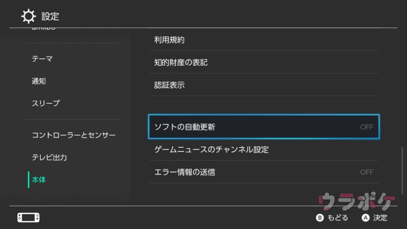 Switch本体の「設定>本体」にある「ソフトの自動更新」をOFFにします。