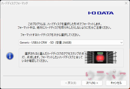 ツールを起動してフォーマットするSDカードを上記画像のように選択します。(名前とかは違うと思います)