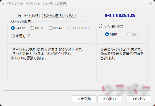 フォーマット形式を「FAT32」にパーティション形式を「MBR」に設定されていることを確認した上で次に進み、そのままフォーマットを完了させてください。