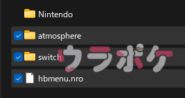「Nintendo」フォルダは一度SwitchにSDカードを挿入した状態で起動すると生成されるフォルダなので、この時点でなくても問題ありません。