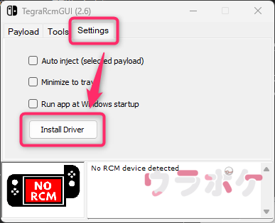 TegraRcmGUIを起動し「Settings」→「Install Driver」をクリックします。その後確認画面が表示されるのでそのままドライバーをインストールしてください。