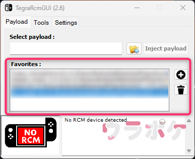 TegraRcmGUIの「Payloadタブ」に戻って「Favorite」にある古いPayloadを削除します。それぞれ選択したあとに右にあるゴミ箱を押すことで削除することができます。