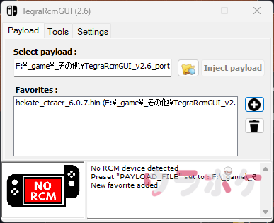 上部の「Select payload」から「hekate_ctcaer_6.5.1(記事更新時点のファイル名)」を選択し、+ボタンで登録しておきましょう。